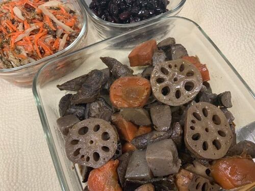 今年のおせち料理。 もっと何品も作ろうと思っていましたが、育児で、というか、未だに続く頻回授乳でちょい疲れ気味なので(笑)ムリしないことにしました。来月あたり、いよいよ断乳の予定です。 根菜の炒り煮アマランサスの松前漬風黒豆のブドウジュース…