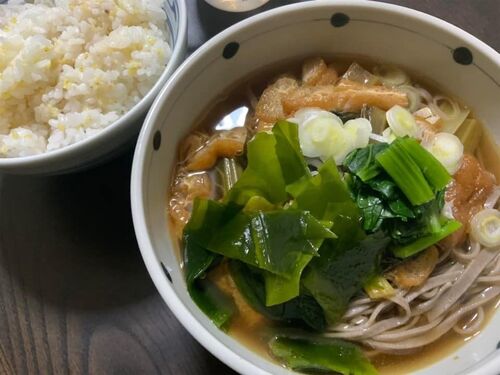 年越しそばならぬ、年迎え(?)そば。 おそばがたくさんあるので、こんな感じで食べています。 小松菜と油揚げの煮物を、煮汁多めで作ってそこにおそばを入れたり。 手作りめんつゆと、天ぷらを添えてみたり。(この日の天ぷらは、レンコン、かぼちゃ、スナッ…